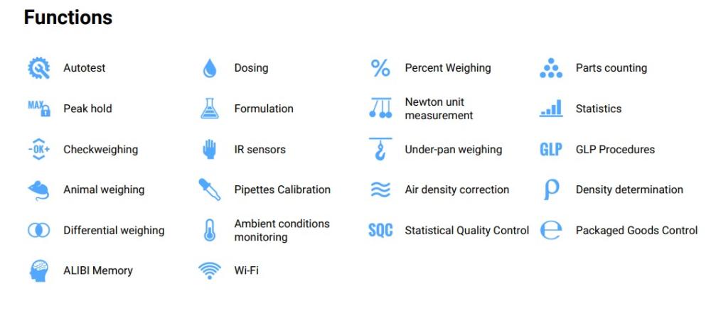 - autotest, dózovanie, odchýlky v %, počítanie kusov, receptúry, meranie v newtonoch, štatistiky, kontrolné váženie, bezdotykový IR senzor, podváhové váženie, GLP procedúry, váženie zvierat, kalibrácia pipiet, korekcia vztlaku vzduchu, stanovenie hustoty, diferenčné váženie, štatistická kontrola kvality, pamňť ALIBI, zmrazenie max. hmotnosti, sledovanie okolných podmienok prostredia, kontrola HBZ, Wifi