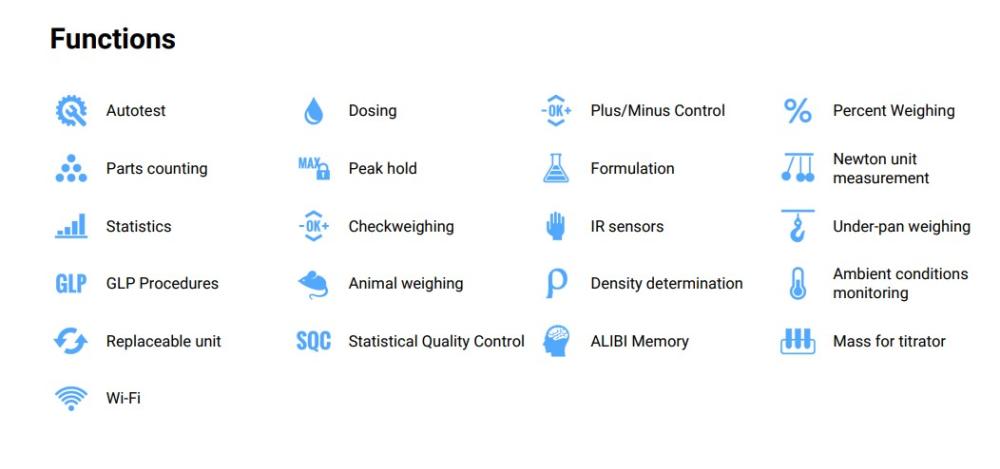 Funkcie: váženie, nulovanie, úplná tara, autotest, počítanie kusov, váženie zvierat, meranie newtonov, určenie hustoty (pomocou voliteľnej súpravy), kontrolné váženie +/-, percentuálne váženie, štatistiky, recepty, postupy SLP, dávkovanie, váženie podváhy - závesné váženie (pre objemné alebo zmagnetizované vzorky), pamäť ALIBI.