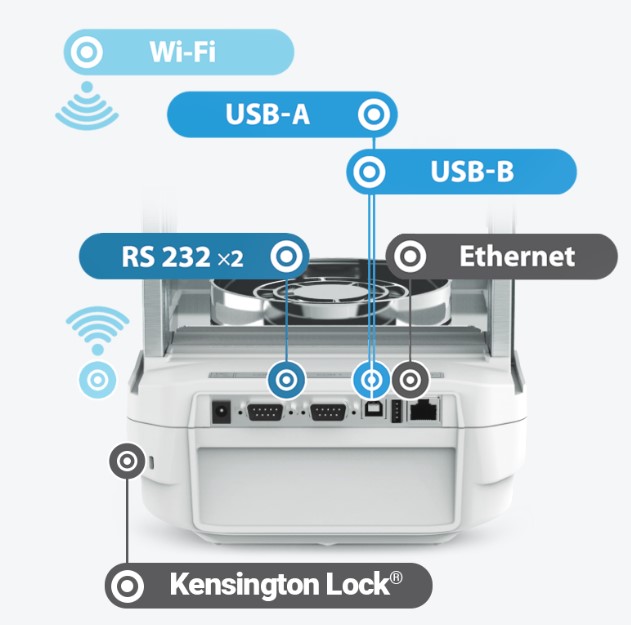 Automatické vnútorné snímanie reagujúce na zmeny teploty a časové intervaly, 7" farebný dotykový displej pre maximálne pohodlie pri ovládaní všetkých funkcií váhy. Najnovšia generácia dotykového panela zaručuje pohodlné ovládanie aj v laboratórnych rukaviciach. Veľký počet klasických a moderných komunikačných rozhraní: RS-232, 2×USB-A, USB-B, Ethernet, WiFi.Vážiaca komora