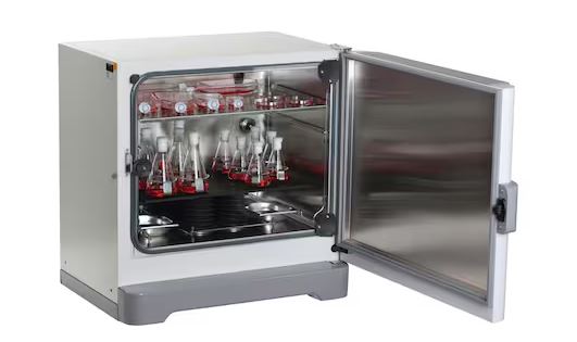 CO2 inkubátor a trepačka v jednom zariadení - platforma pre nádoby a police pre simultánnu alebo samostatnú statickú inkubáciu s CO2Vysoká flexibilita a kapacita nádob - platničky, skúmavky, banky