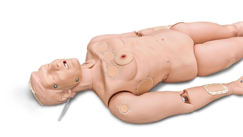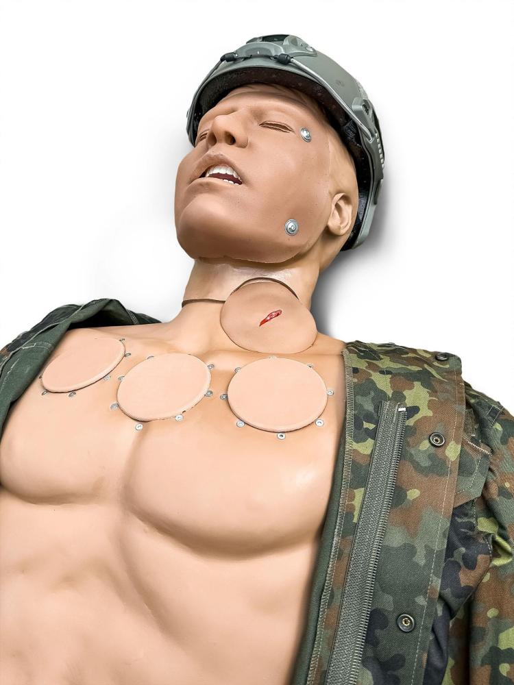 Simulácia traumatických poranení: systém rán s vymeniteľnými modulmi poranení, 4 druhy poranenia (bodné rany, strelné rany, priestrely, slepé rany), funkcia aktívneho krvácania rán, tréning použitia škrtidla k zástave krvácania, obväzovanie rán a aplikácie krytia.