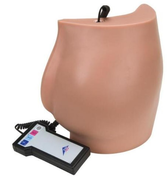 Intramuskulárna injekcia sa dá reálne nacvičiť aj bez skutočného pacienta!Tento vysoko kvalitný intramuskulárny simulátor (navrhnutý na základe Hochstetterovej metódy lokalizácie miesta vpichu) predstavuje model pravej časti zadku so všetkými dôležitými anatomickými pamiatkami pre intramuskulárne (I.M.) injekcie: hrebeň bedrovej kosti, predná horná časť bedrovej chrbtice a trochanter (chocholík). Zabudovaná jemná elektronika produkuje audio-vizuálnu spätnú väzbu výsledku, napr. správna injekcia, kontakt s kosťou alebo nesprávne miesto. Realistická silikónová koža je extrémne odolná a v prípade potreby sa dá rýchlo a jednoducho vymeniť.
