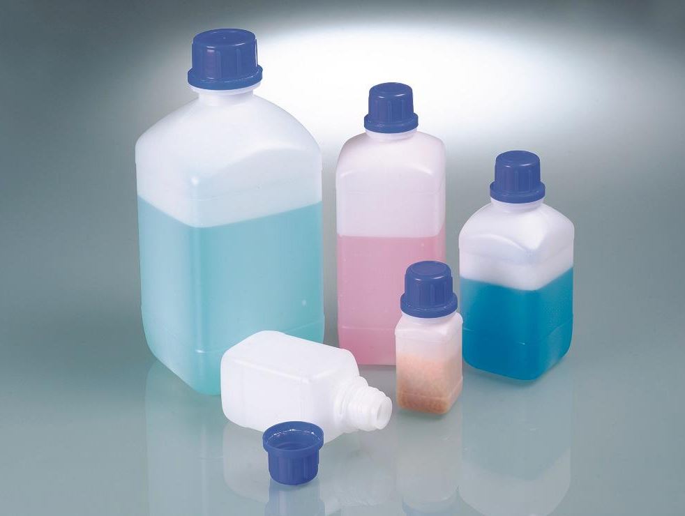 - Fľaša na vzorky, úzkohrdlá, HDPE, hranatá s uzáverom