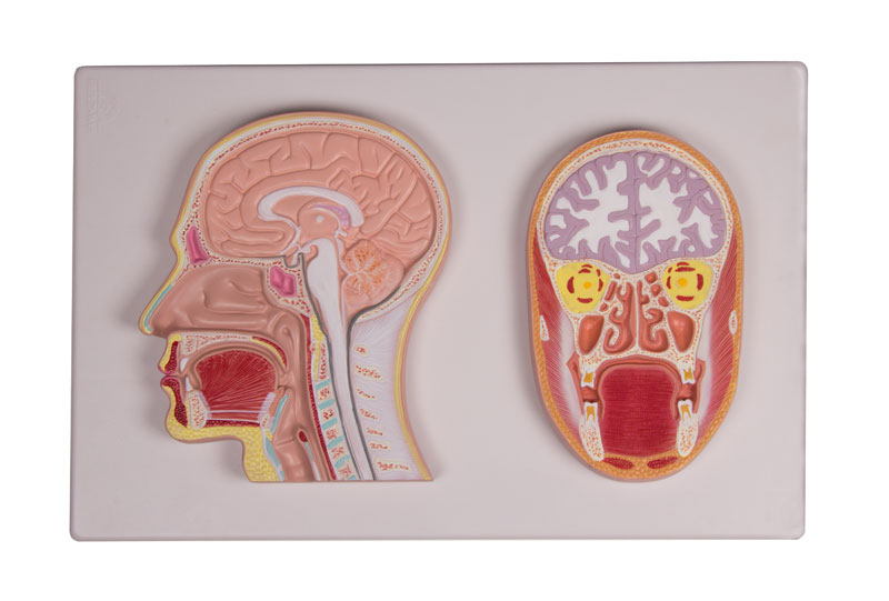 Frontálny (čelný) a mediálny (stredový) prierez ľudskou hlavou zobrazuje povrchové a vnútorné štruktúry hlavy. Porovnanie oboch prierezov umožňuje pochopenie anatomickej stavby hlavy. Reliéfny model na doske. Veľkosť: 55 x 35 x 3 cm, hmotnosť 2 kg. Vďaka aplikácii Augmented Anatomy (verzia EN, DE) v kombinácii s týmto kvalitným anatomickým modelom je učenie jednoduchšie a efektívnejšie. Aplikácia automaticky rozpoznáva anatomické modely EZ a zobrazuje nomenklatúru v rozšírenej realite. Aplikácia rozšírenej anatómie funguje na všetkých bežných smartfónoch alebo tabletoch.