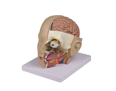 Ľavá strana je vertikálne a horizontálne rozrezaná, aby bolo možné pozorovať štruktúry lebky aj mozgu.