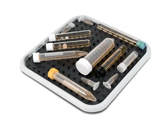 Jamkovaná protišmyková podložka PDM zabraňuje kotúľaniu sa skúmaviek rôznych veľkostí po plošine.