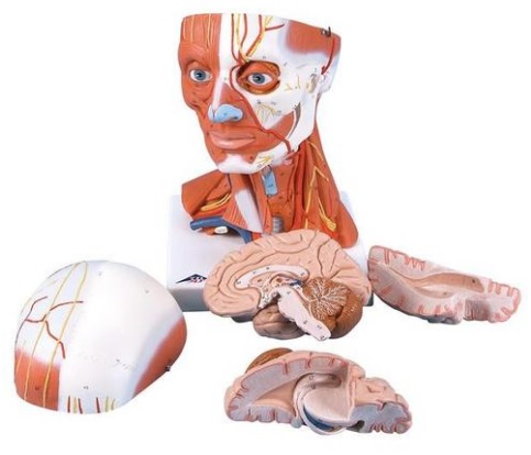 Zobrazenie povrchného a hĺbkového svalstva, nervov a ciev. Rozkladateľný model svalstva hlavy a krku sobsahuje aj trojdielny mozog. Tento vysoko kvalitný model je dodávaný na základnej doske.