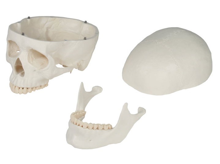 Model lebky má všetky anatomické detaily a štruktúry. Trojdielny model sa skladá z lebky, lebečnej klenby a dolnej čeľuste. Zuby zodpovedajú skutočnému chrupu, čo sa týka polohy a ostria. Dolná čeľusť je pohyblivá a demontovateľná. Klenba lebky sa pomocou kovových čapov pripevňuje na základňu lebky a držia ju silné magnety. Z tohto dôvodu nie sú potrebné rušivé háčiky. Model zodpovedá priemernému dospelému Európanovi. Veľkosť modelu : 18 x 19 x 12 cm, hmotnosť: 0,7 kg.Vďaka aplikácii Augmented Anatomy (verzia EN, DE) v kombinácii s týmto kvalitným anatomickým modelom je učenie jednoduchšie a efektívnejšie. Táto aplikácia automaticky rozpoznáva anatomické modely EZ a zobrazuje nomenklatúru v rozšírenej realite. Aplikácia rozšírenej anatómie funguje na všetkých bežných smartfónoch alebo tabletoch.