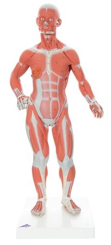 57 cm vysoký model ľudského tela znázorňujúci farebne odlíšené svalstvo od šliach. Možnosť odstránenia hrudnej časti a zobrazenie vnútorných orgánov. Na pravej strany modelu je zobrazená ženská prsná žľaza. Model je umiestnený na podstavci. Rozmery: 57x25x18 cm. Hmotnosť: 1,6 kg.