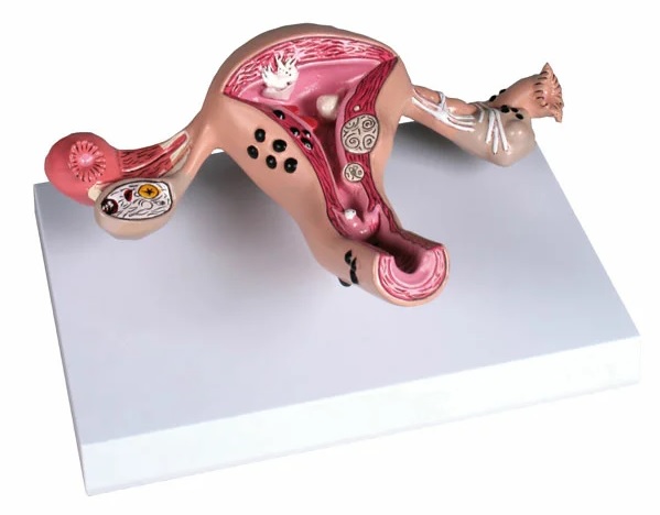 Model maternice s viacerými ochoreniami v životnej veľkosti. Zobrazuje endometriózu, cysty, zrasty, fibróm, karcinóm krčka maternice, sarkóm, adenomyózu, polypy a salpingitídu. Súčasťou modelu je aj ostatná anatómia: vagína, krčok maternice, endometrium, myometrium, endocervikálny kanál, dutina maternice, vajíčkovod, vaječník, fimbriu, folikuly a mezosalpinx. Na odnímateľnom stojane.Veľkosť modelu: 23 x 16 x 6 cm, hmotnosť: 0,5 kg