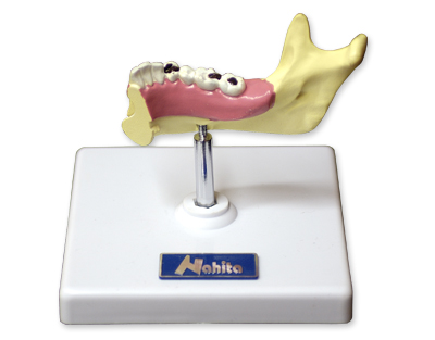 Pravá polovica spodnej čeľuste s chrupom s niekoľkými kazmi.Má pohyblivú otváraciu časť, ktorá umožňuje zobrazovať krvné zasobovanie a zubné korene. Vyrobená z PVC s podstavcom