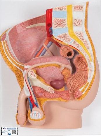 Model panvy muža. Polovica mužských pohlavných orgánov s mechúrom a konečník sú odnímateľné. Reliéfny model, možnosť namontovania na stenu.