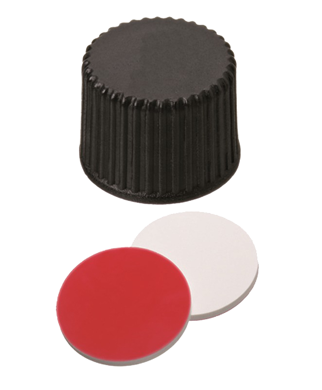 Uzáver závit ND8, PP čierny, drážka, septa sil.biela/PTFE červ., 100ks