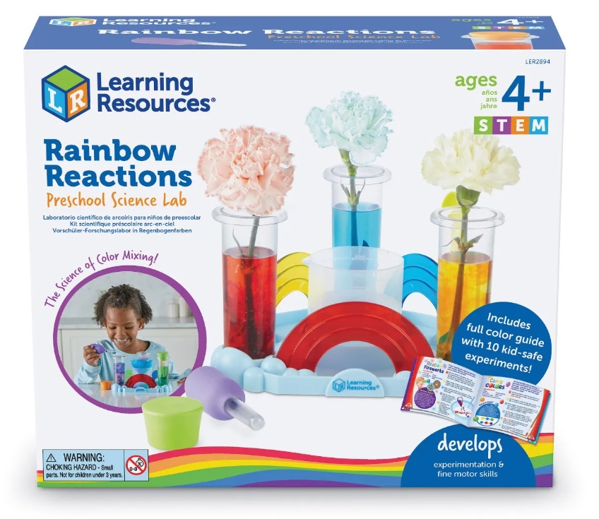 Obsah: 1 podstavec Rainbow Reactions, 3 skúmavky so zátkou, 3 dúhové šošovky, 1 lievik, 1 pipeta, 1 čajová lyžička, sprievodca aktivitami.