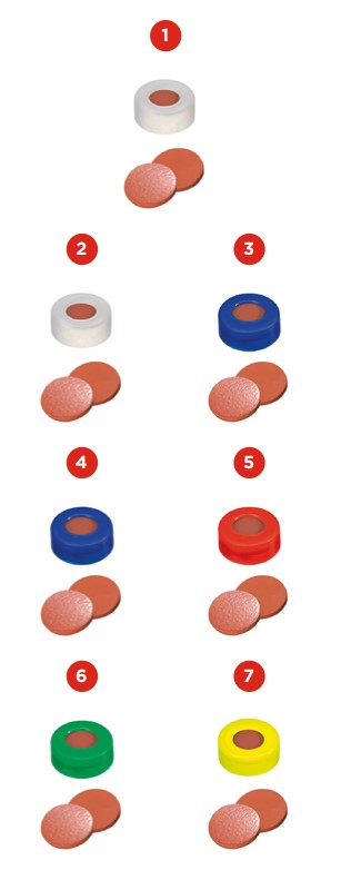 Septá z prírodného kaučuku / TEF (PTFE) sú tepelne odolné od -40 °C do +120 °C a vďaka výborným vlastnostiam opätovného utesnenia sú ideálne na opakované vpichy ihlou.